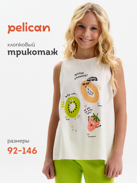 Майка для девочки. Выполнена из мягкого трикотажного полотна. Свободный трапециевидный силуэт с лёгким перепадом по низу делает модель удобной и не сковывает движения. Горловина и проймы аккуратно обработаны эластичной рибаной в тон ткани. Перевод: МОЖЕТ БЫТЬ СМУЗИ? ПОЧЕМУ НЕТ... О, ДА Я С ВАМИ! Я ОЧЕНЬ ЭКЗОТИЧНА. ПАПАЙЯ, КИВИ, КЛУБНИЧКА.
