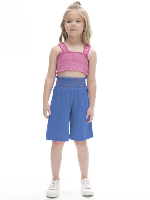 Шорты-бермуды из 100% хлопка для девочки. Натуральный состав ткани и свободный крой обеспечивают комфорт вашему ребёнку. Изделие приятное на ощупь и отлично подходит для жаркой погоды. Пояс модели украшает горизонтальная сборка контрастными нитками с деликатным рюшем вверху — актуальный летний тренд. Такие шорты будут носиться долго. Ребёнок растёт, и они словно "растут" вместе с ним. Однотонные яркие бермуды легко сочетать с топами и футболками различных силуэтов и расцветок.