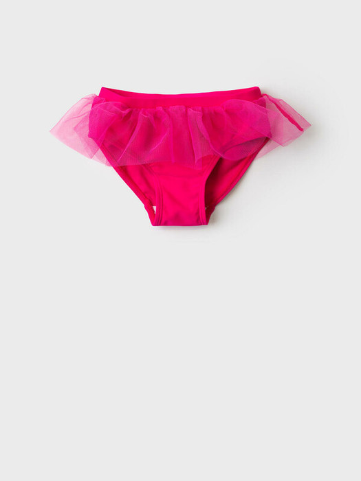 Детские купальные плавки для девочки. Модель ярко-розового цвета с широкой декоративной оборкой по поясу. Оборка сделана из легкого полупрозрачного материала, что придает модели нарядный вид. Внутри предусмотрена подкладка. Все края обработаны эластичной тесьмой, чтобы изделие хорошо сидело на теле и не натирало. Благодаря UF-защите, ткань сохраняет первоначальный вид даже при длительном пребывании на солнце. Подходит для плавания и активного отдыха.