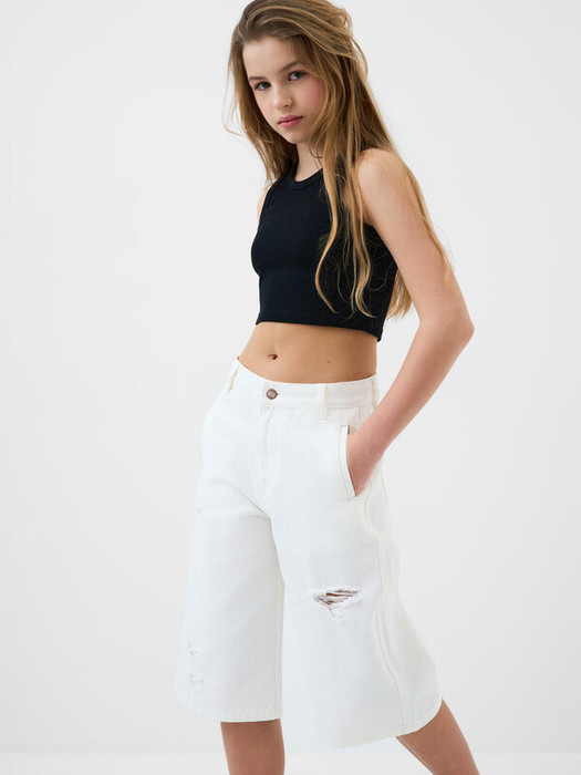 Свободные джинсовые шорты длиной до колена для девочки подростка. Выполнены из светлого денима. Спереди — классическая застёжка на молнию и пуговицу, пояс сзади частично на резинке для комфортной посадки. Карманы: два спереди и два накладных сзади.
