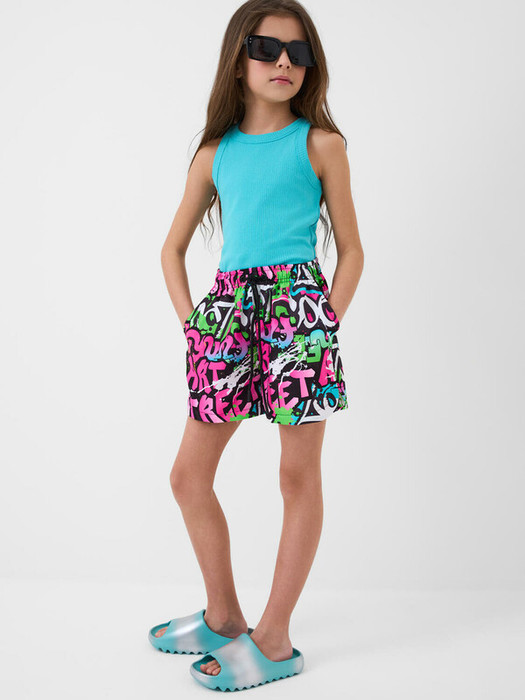 Яркие плавательные шорты для девочки подростка. Шорты средней длины, с удобной посадкой и эластичным поясом, который дополнен шнурком для регулировки. По бокам — удобные карманы. Внутри — лёгкая сетчатая подкладка. Дизайн выполнен в стиле уличного граффити: чёрная основа с цветными надписями и мазками неоновых оттенков — розового, зеленого и белого. Идеальны для пляжа или бассейна.