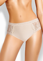 Трусы-макси женские из плотного эластичного хлопкового полотна. Обработка краев - ажурной резинкой с фестоном. По переду вставки из кружева и бант.