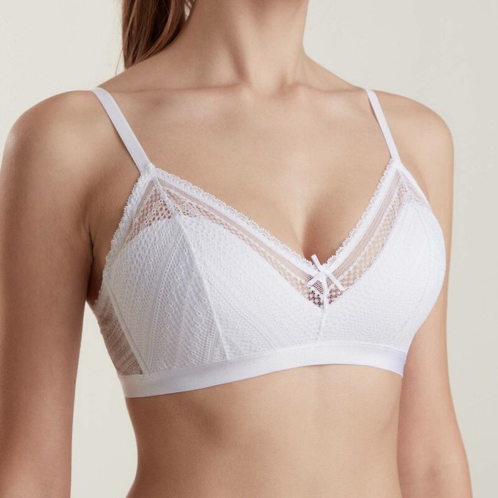 Бюстгальтер без каркасов Vintage RB7087 выполнен из кружева с ажурным орнаментальным рисунком и прямым краем. Чашки на подкладке из дубляжа с хлопком. Модная треугольная форма, безупречная посадка на фигуре и абсолютный комфорт – визитная карточка модели.