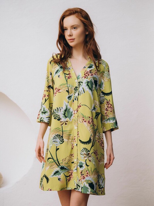 Туника выполнена в зелёном цвете, она украшена цветочным принтом с изображением растений.