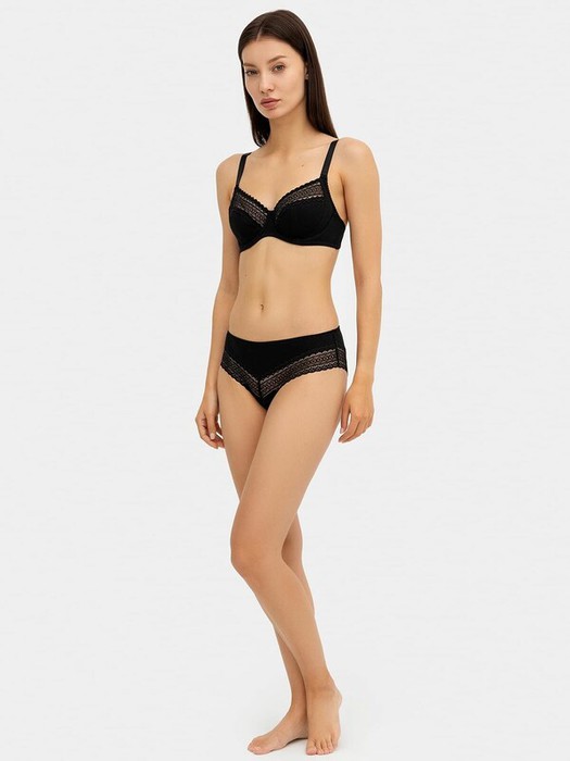 Бюстгальтер с мягкими чашками, с боковой корректирующей деталью. Тип каркаса 50. Чашки из рибаны на подкладке из кулирной глади, швы расстрочены бейками из монокапрона. Верхний срез чашек декорирован кружевом шириной, под верхним краем кружева с изнаночной стороны настрочена эластичная тесьма..