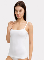 Майка полуприлегающего силуэта с V-образным вырезом. Выполнена из трикотажного полотна кулирного переплетения, а зона декольте – из полупрозрачного кружева. Длина – до середины бедра.