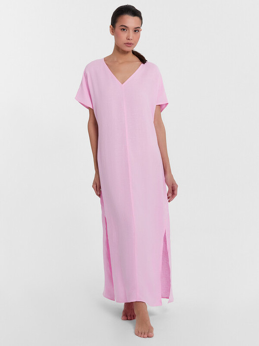 Платье прямого силуэта, длина макси. По переду и спинке средний шов. Горловина V-образной формы. Вырез горловины обработан в чистый край. Рукава цельнокроеные, обработаны в чистый край. По боковым швам разрезы. Низ платья обработан швом в подгибку.
