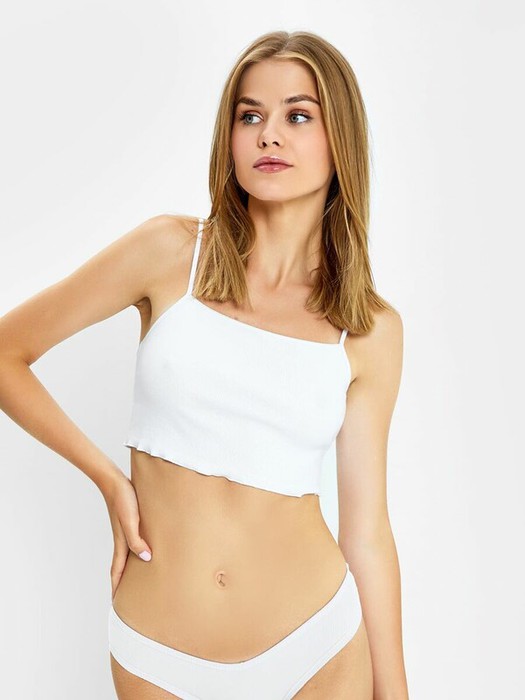 Стильный топ на тонких бретелях. Выполнен из хлопковой трикотажной рибаны в рубчик. Особенность модели – закрученный нижний срез. Идеальное решение для теплого времени года!