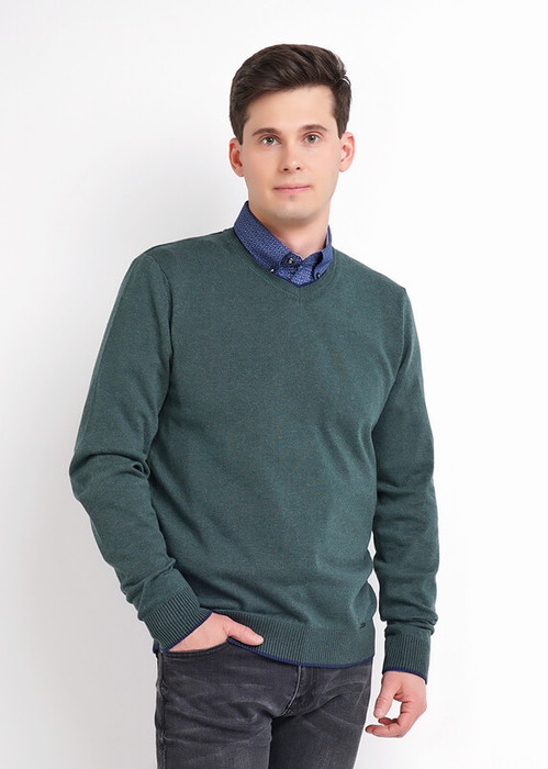Размер MAXI. Мужской вязаный джемпер с V-образным вырезом горловины в базовом ассортименте. Целостность модели придают двойная контрастная горловина, декоративная полосатая тесьма и провязаная обтачка по спинке. Модель дополняет металлофурнитура по низу.