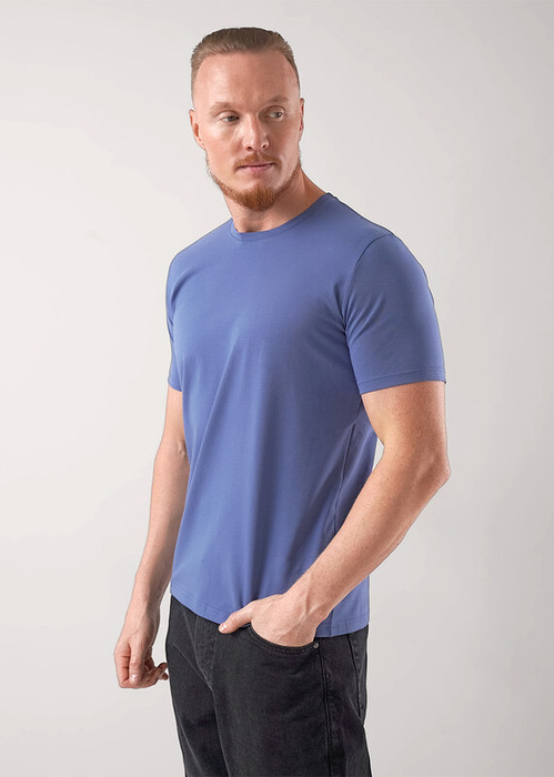 Базовая однотонная футболка стандартного объема с круглой горловиной, втачным рукавом из хлопкового полотна с добавлением эластана. Является неотъемлемой частью мужского гардероба.