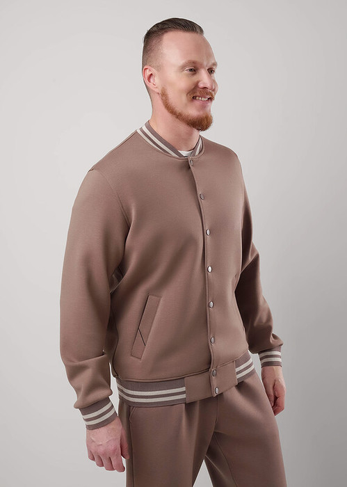 Мужской бомбер на кнопках из трикотажного полотна. Особенностью изделия являются вязаные отделки, в виде воротника, пояса и манжет. Стильное решение для повседневного образа.