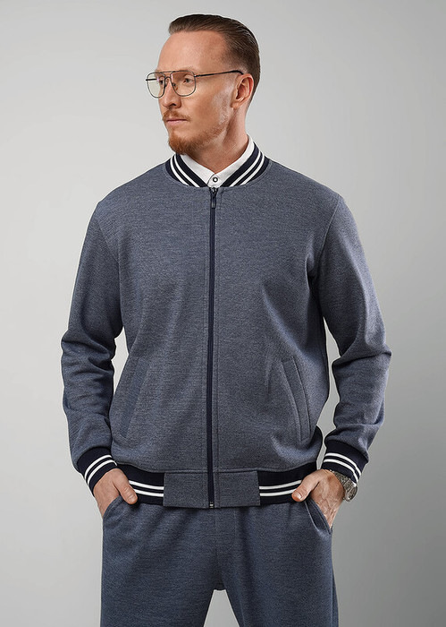 Мужской бомбер на молнии из жаккардового трикотажного полотна. Дизайн модели дополнен имиджевой фурнитурой. Прорезные карманы, эластичные вязаные манжеты и пояс добавляют удобства в носке. Стильное решение для похода на учебу или работу.