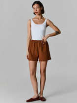 Шорты свободные, короткие из ткани. Посадка средняя. Пояс цельнокроеный с эластичной тесьмой внутри (внутр. 20мм 20RV). С внешней стороны пояса пробиты петли  и вставлен шнур-бейка из основного полотна. Нижние срезы шорт обработаны швом вподгибку с закрытым срезом.