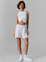 Шорты свободные, короткие из ткани. Посадка средняя. Пояс цельнокроеный с эластичной тесьмой внутри (внутр. 20мм 20RV). С внешней стороны пояса пробиты петли  и вставлен шнур-бейка из основного полотна. Нижние срезы шорт обработаны швом вподгибку с закрытым срезом.