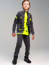 Модные брюки-джоггеры прямого силуэта для мальчиков. Выполнены из трикотажного футера с теплым и нежным подчесом. Пояс с эластичной тесьмой внутри и регулировочным шнуром-завязкой. Штанины завершаются манжетами. Есть удобные боковые карманы.