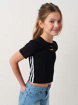 Футболка прямого силуэта. Перед и спинка цельнокроенные. Горловина круглой формы, широкая бейка из рибаны. Рукав втачной, широкий. Футболка слегка укорочена. Подгибки низа и рукава широкие.