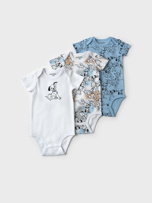 Комплект из трёх боди для новорождённого мальчика. Все модели с коротким рукавом и застежкой на кнопки между ножек. Два ряда кнопок. Горловина с запахом на плечах — удобно надевать через голову. Один боди белый с ярким принтом собак и надписями, второй — голубой с аппликацией собачки, третий — голубой с аналогичным принтом. Выполнены из мягкого хлопкового трикотажа, приятного к телу.