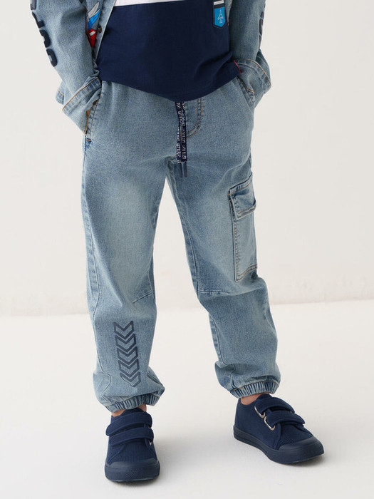 Детские джинсы-джоггеры для мальчика. Выполнены из светло-голубого денима. Модель со средней посадкой и комфортным свободным кроем, идеально подходит для активных мальчиков. Пояс на резинке дополнен регулируемым шнуром. Боковые карманы, один накладной сбоку и один сзади.