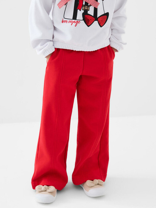 Спортивные широкие детские брюки для девочки. Выполнены из мягкого хлопкового трикотажа футер без начеса. Пояс на резинке, для регулировки талии предусмотрен шнур. По бокам расположены карманы.