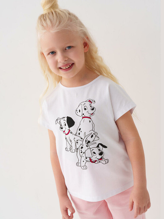 Детская футболка для девочки. Модель свободного кроя, выполнена из эластичного хлопкового трикотажа джерси. Спереди расположен крупный принт с героями из любимого мультфильма "101 далматинец". Горловина круглая. Сзади декорирована бантом.