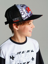 Бейсболка детская для девочки. Передняя часть выполнена из сиреневой ткани с ярким принтом, а задняя часть — из светло-жёлтой сетки, обеспечивающей вентиляцию. Козырёк розового цвета, изогнутый. Сзади предусмотрена пластиковая застёжка на кнопках для регулировки объёма.