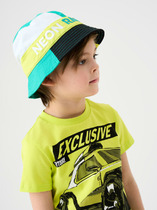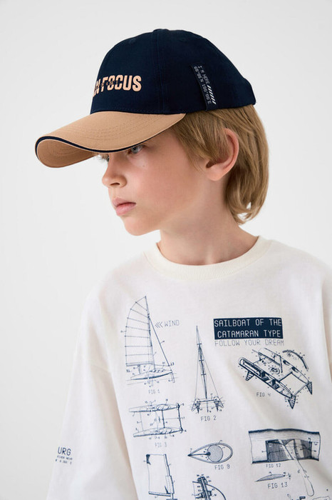 Бейсболка для мальчика подростка. Изготовлена из плотного хлопкового тёмно-синего текстиля с контрастным бежевым козырьком. На передней части расположен крупный принт. Козырек изогнутый. Сбоку — вертикальный ярлык. Застежка сзади пластиковая на кнопках, регулируется по объему. На макушке — обтянутая пуговка, имеются вентиляционные люверсы.