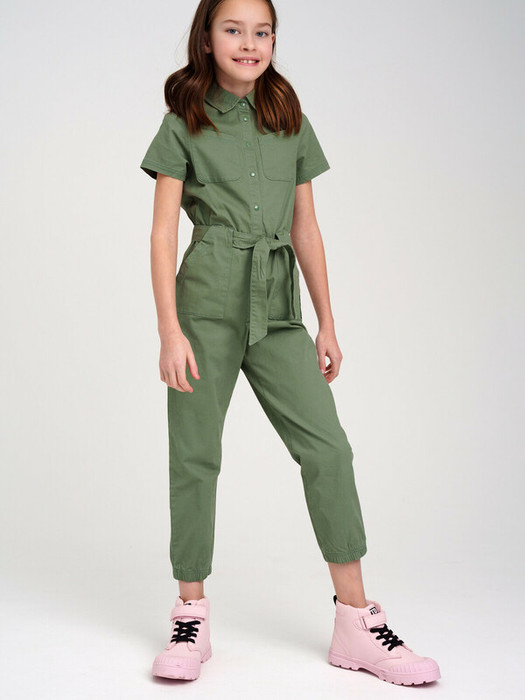 Комбинезон с поясом из твила; высокое содержание хлопка 98%, а благодаря наличию эластана в составе ткани изделие проще в уходе и держит форму. Модель застегивается на кнопки