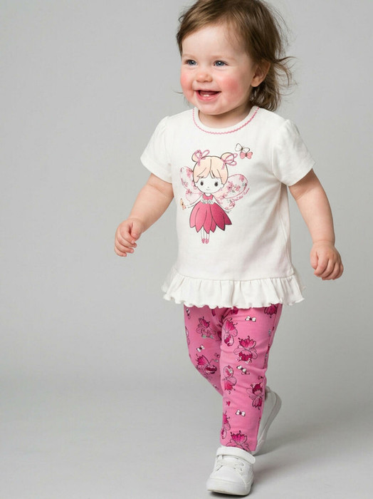 Нежный детский комплект для девочки. Состоит из футболки с коротким рукавом и брюк. Выполнен из хлопкового трикотажа. Футболка украшена крупным принтом с феей. По низу футболки - рюша, которая добавляет образу воздушности. Горловина округлая, а на плече предусмотрены кнопки для удобного переодевания. Брюки с рисунком с феями, цветами и бабочками. Посадка высокая, пояс на мягкой резинке с декоративным шнурком для регулировки посадки.