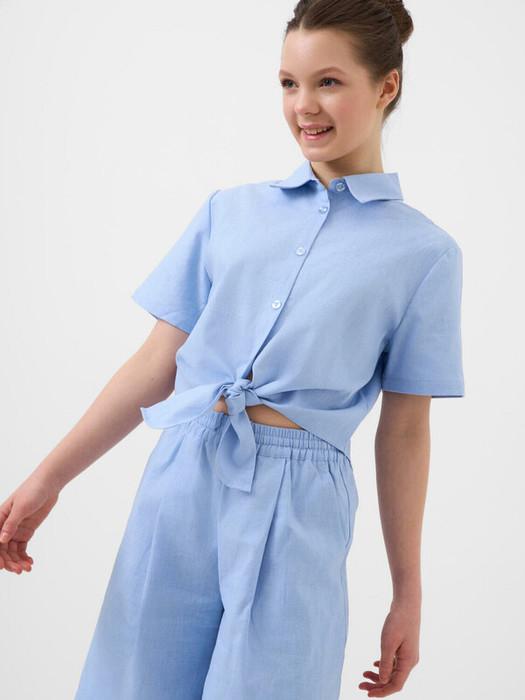 Легкий льняной костюм для девочки подростка. Рубашка прямого кроя с коротким рукавом и застежкой на пуговицы. Классический воротник, укороченная длина с завязками на талии. Свободные шорты на резинке со шнурком для регулировки. Удобные боковые карманы.