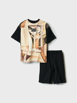Легкий детский хлопковый костюм для мальчика. Рубашка прямого кроя с коротким рукавом и застежкой на кнопки. Классический воротник, накладные карманы. Свободные шорты на резинке со шнурком для регулировки. Удобные боковые карманы и карманы-карго.