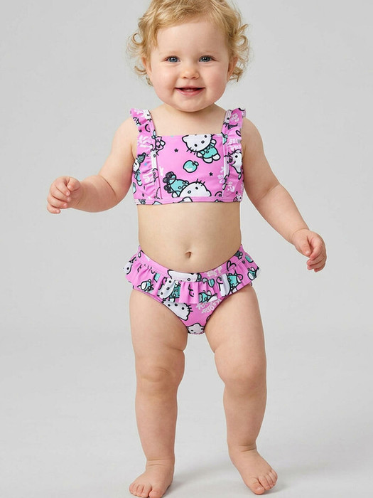 Купальник детский раздельный для девочки. Выполнен в светло-розовом цвете с принтом Hello Kitty, конфетами и сердечками. У топа — широкие бретели с милыми воланами, которые делают образ особенно воздушным. Плавки украшены воланом по линии талии, создавая нежный. Все детали сделаны из мягкой эластичной ткани, с подкладкой внутри. Благодаря UF-защите, ткань сохраняет первоначальный вид даже при длительном пребывании на солнце. Подходит для плавания и активного отдыха.