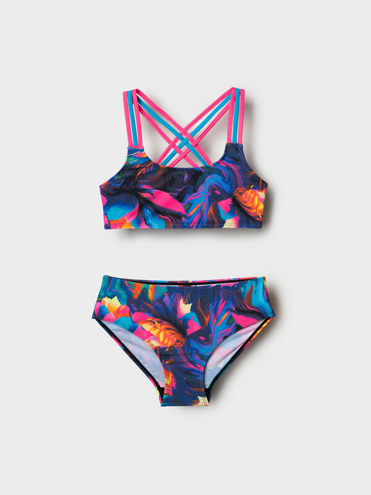 Купальник для девочки подростка. Верх выполнен без застёжек, с удобной посадкой и эффектными перекрещивающимися бретелями в контрастных цветах: розовом и бирюзовом. Вся поверхность изделия покрыта красочным абстрактным принтом с переходами насыщенных цветов – от фуксии до бирюзы и синего. Костюм выполнен из эластичного трикотажа с подкладкой в нижней части и усилен силиконовой лентой по краям, чтобы хорошо держал форму. Благодаря UF-защите, ткань сохраняет первоначальный вид даже при длительном пребывании на солнце. Благодаря мягким швам и комфортной посадке изделие подойдёт для активного отдыха и плавания.