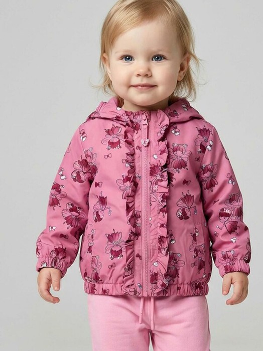 Детская ветровка для девочки. Температурный режим от +20С до +10С. Ткань с ветрозащитным и водоотталкивающим покрытием. Внутри трикотажная подкладка. Капюшон несъемный на резинке. Два боковых кармана на липучке. Низ изделия и рукава собраны на резинку для плотного прилегания. На спинке, капюшоне и рукавах есть светоотражающие элементы для безопасности в темное время суток.