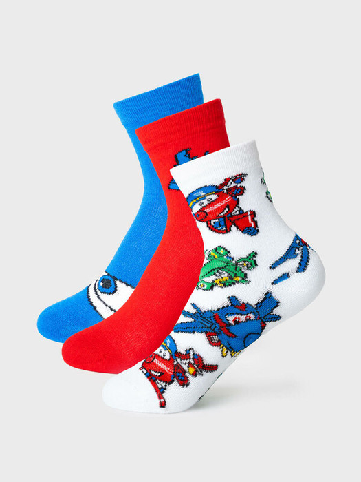 Набор детских носков с нескользящей подошвой для мальчика. Комплект из трёх пар детских носков. В комплекте три дизайна: белые с яркими принтами персонажей Super Wings, однотонные синие с мультяшным глазом и красные с небольшими вышивками самолётов. На подошве у всех носков есть силиконовые стопперы для безопасности. Удобный эластичный верх хорошо фиксирует носки, не сдавливая ногу. Размеры указаны на стопе.  Материал — мягкий хлопковый трикотаж.
