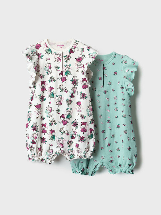 Набор из двух песочников для новорождённой девочки. Один песочник украшен принтом с милыми феями и цветами на светлом фоне, другой — с мелкими ягодками и цветами на зелёном фоне. Рукава выполнены в виде крылышек и придают изделию нежный и воздушный вид. Песочники застёгиваются на кнопки спереди и снизу, что удобно для переодевания малыша. Внизу изделия используется эластичная сборка, создающая мягкую посадку вокруг ножек. Изделия выполнены из мягкого и дышащего, хлопкового трикотажа интерлок.