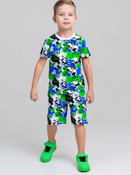 Пижама детская для мальчика. Футболка и шорты из эластичного и приятного на ощупь трикотажа. Шорты на резинке со шнурком.  Шорты с карманами в боковых швах. Высокое содержание хлопка 95%. Благодаря наличию эластана в составе ткани изделие держит форму и меньше мнется.