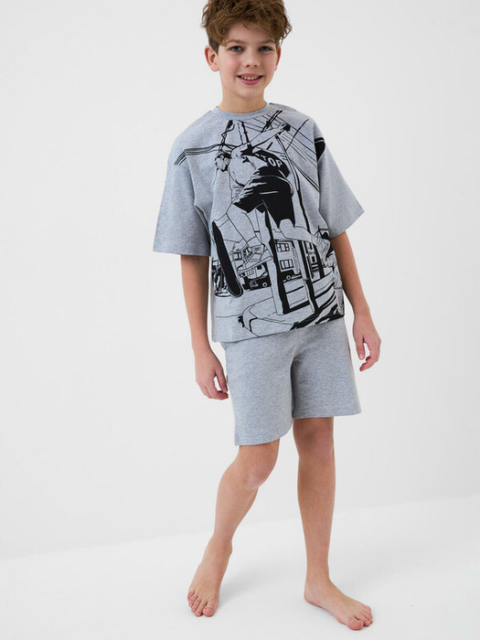 Пижама для мальчика подростка. Состоит из серой футболки оверсайз с короткими рукавами и серых шорт. Материал - хлопковый трикотаж. На футболке спереди нанесён яркий принт с изображением скейтера в движении. Вырез горловины круглый, с эластичной резинкой. Шорты свободного кроя, с боковыми карманами и эластичным поясом. Пояс дополнен шнуром.