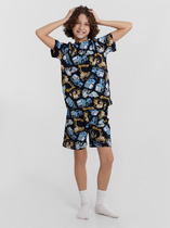 Пижама для мальчика подростка. Футболка оверсайз с короткими рукавами и круглым воротом оформлена крупным принтом на спинке с изображением скейтбордиста, а спереди — креативным принтом. Шорты имеют камуфляжный узор в чёрно-серой гамме и дополнены ярко-оранжевым декоративным шнурком в поясе. На шортах предусмотрены боковые карманы. Изделие выполнено из мягкого хлопкового трикотажа.