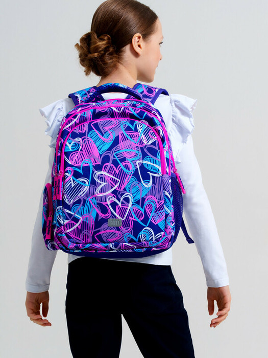 Школьный рюкзак для девочки подростка. Прямые широкие регулируемые лямки с мягкими вкладками и сетчатым покрытием для улучшения вентиляции, 3 основных отделения на молнии, 2 боковых кармана: сетчатый и на молнии. Внутри: 1 отсек: карман на молнии, открытые карманы для канцелярии. 2 отсек: без карманов, 3 отсек: карман для папок, карман на молнии, 2 кармана без замка, карабин для крепления пропуска/пенала/ключей, усиленная спинка, дно и верхняя ручка, спинка и обратная часть плечевых ремней - сетчатые, для улучшенной вентиляции, светоотражающие элементы на переднем кармане и плечевых ремнях
