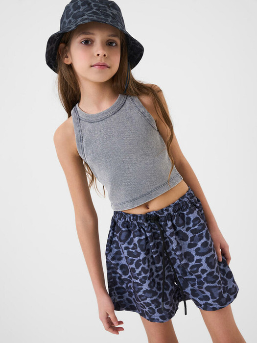 Плавательные шорты средней длины для девочки подростка. Модель с комфортной посадкой на талии и анатомически закруглённым краем по бокам. Выполнены из лёгкой ткани с выразительным леопардовым принтом в серо-чёрной гамме. Внутри — сетчатая подкладка, обеспечивающая комфорт при носке. Шорты дополнены двумя удобными боковыми карманами и шнурком на талии, который помогает отрегулировать посадку. Эластичный пояс обеспечивает хорошее прилегание. Яркий, смелый дизайн и функциональность делают эту модель идеальной для летнего отдыха. Благодаря UF-защите, ткань сохраняет первоначальный вид даже при длительном пребывании на солнце.