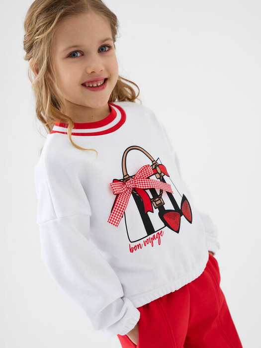 Детский свитшот оверсайз для девочки. Выполнен из хлопкового футера без начеса. На передней части — выразительный принт с паетками и бантиком. Горловина, манжеты и низ изделия оформлены эластичными резинками.