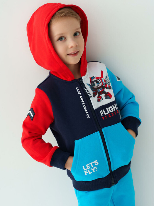 Детская толстовка на молнии с капюшоном для мальчика. Выполнена из хлопкового футера без начеса. Красочный принт. Удобные карманы. Манжеты и низ изделия выполнены из эластичного риба, что обеспечивает комфортную посадку.