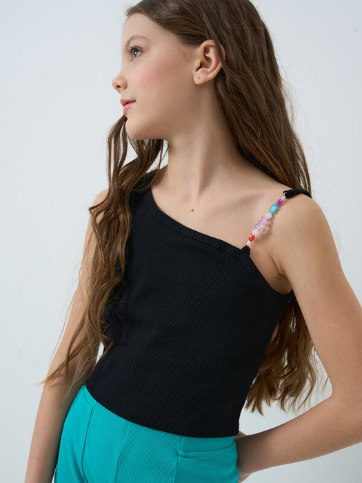 Укороченный трикотажный топ в рубчик для девочки подростка. Асимметричный крой — на одно плечо, с декоративной бретелью, украшенной цветными бусинами. Декор в виде бусин придаёт изделию яркий, модный акцент.