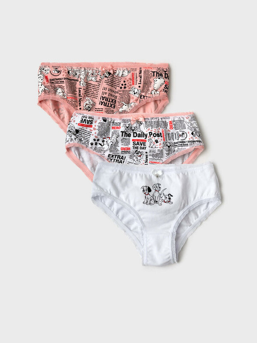 Набор из трех детских трусов-брифов для девочки. Изделия выполнены из мягкого, хлопкового эластичного трикотажа, с широкой резинкой по поясу и окантовкой по вырезам для ног. Принт с любимыми героями мультфильма "101 далматинец". Внутри предусмотрена ластовица.