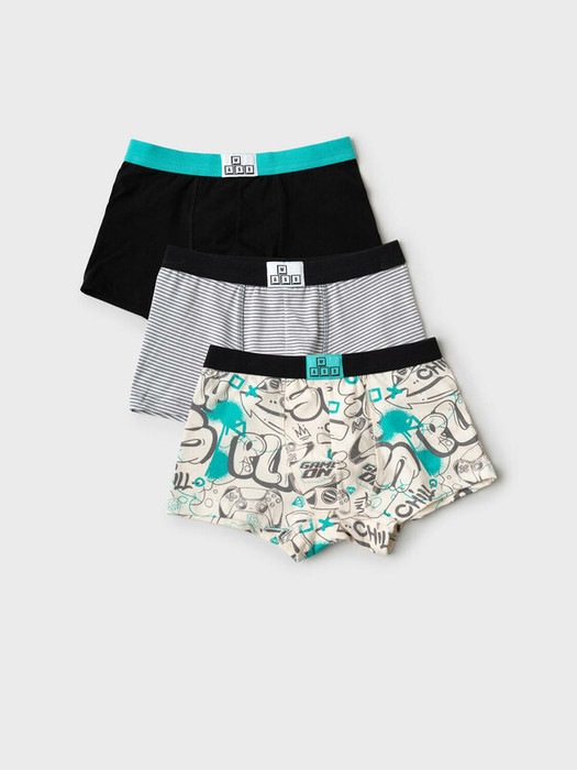 Набор из трех трусов-боксеров для мальчика подростка. Изделие плотно прилегает к телу, не имеет боковых швов, что делает его особенно комфортным. Эластичный пояс с логотипом бренда обеспечивает надёжную посадку. Материал — мягкий хлопковый трикотаж, приятный к телу.