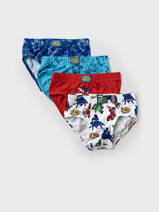 Набор из четырех детских трусов-брифов для мальчика. У изделий удобный эластичный пояс, мягкие обработанные края пройм и анатомическая вставка спереди. Такой крой обеспечивает хорошую посадку и комфорт в носке. Принт с любимыми мультяшными героями - Super Wings. Материал - хлопковый, мягкий трикотаж.