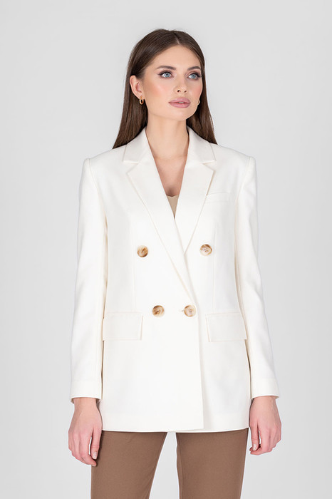Элегантный двубортный жакет из фактурной костюмной ткани молочного цвета. Полуприлегающий силуэт с английским воротником и застежкой на пуговицы. На передней части жакета выполнен нагрудный карман с листочкой и карманы в рамку с клапаном. По центру задней части выполнена шлица - элемент декоративный и необходимый. Обеспечивает свободу движения, добавляет шику и элегантности. Втачной длинный рукав, снизу имитация шлицы с контрастными пуговицами. Изделие идеально держит форму, имеет четкую линию плеча благодаря плечевым накладкам. Жакет на подкладке молочного цвета.