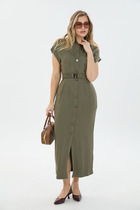 Платье-жилет прямого силуэта из плательной ткани с разрезами в боковых швах. Изделие со спущенной линией плеча, без вытачек, на запахе. Лацканы воротника и края борта асимметричные. Накладные карманы со скошенной линией входа в карман. Пояс из основной ткани в комплекте. Во избежание потери пояса, пояс зафиксирован в боковом шве изделия временным швом, его легко удалить.