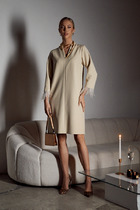 Платье свободного силуэта из вискозной плательной ткани. Изделие отрезное по линии талии, с ярусами на юбке. V-образный вырез горловины с декоративной завязкой. Рукав втачной, снизу присборен и окантован бейкой. В комплекте пояс из основной ткани. В таблице размеров представлены параметры человека, а не изделия.