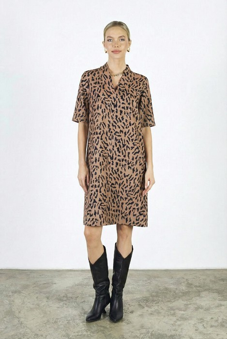 Платье свободного силуэта из плательной ткани. По центру передней части изделия выполнен шов. Цельнокроеная стойка, переходящая в V-образный вырез горловины, визуально делает фигуру стройнее. Втачной короткий рукав.